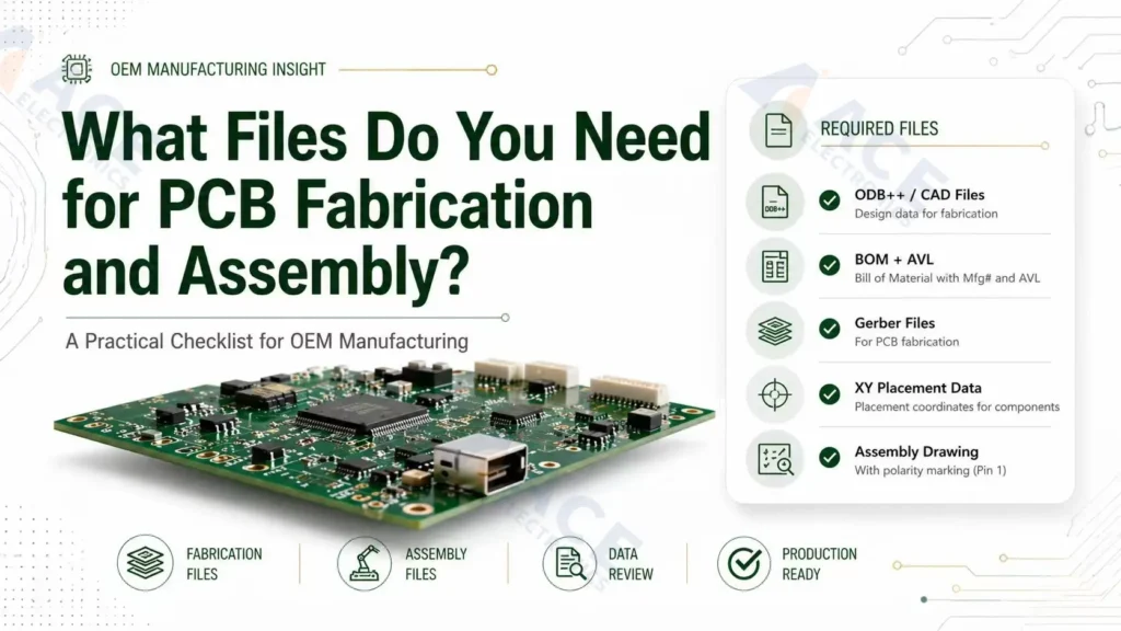 For PCB fabrication and assembly, most OEM projects need Gerber and drill files for the bare board, a BOM for component sourcing, a pick-and-place file for SMT placement, and assembly drawings for orientation and special instructions. More complex PCBAs may also need stackup data, fabrication drawings, test procedures, programming files, and revision notes.